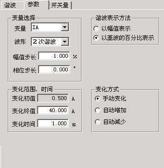 幅值步長(zhǎng):這里的步長(zhǎng)也與“諧波表示方法”相對(duì)應(yīng)。當(dāng)選擇“以幅值表示”時(shí),步長(zhǎng)也以幅值表示,單位是A或V;而選擇“以基波的百分比表示”時(shí),則步長(zhǎng)也是百分比。