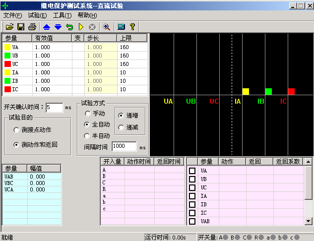 直流試驗模塊提供專門的直流電壓和電流輸出,主要是為了滿足做直流電壓繼電器、時間繼電器以及中間繼電器等試驗的要求。直流模塊的主界面如圖所示: