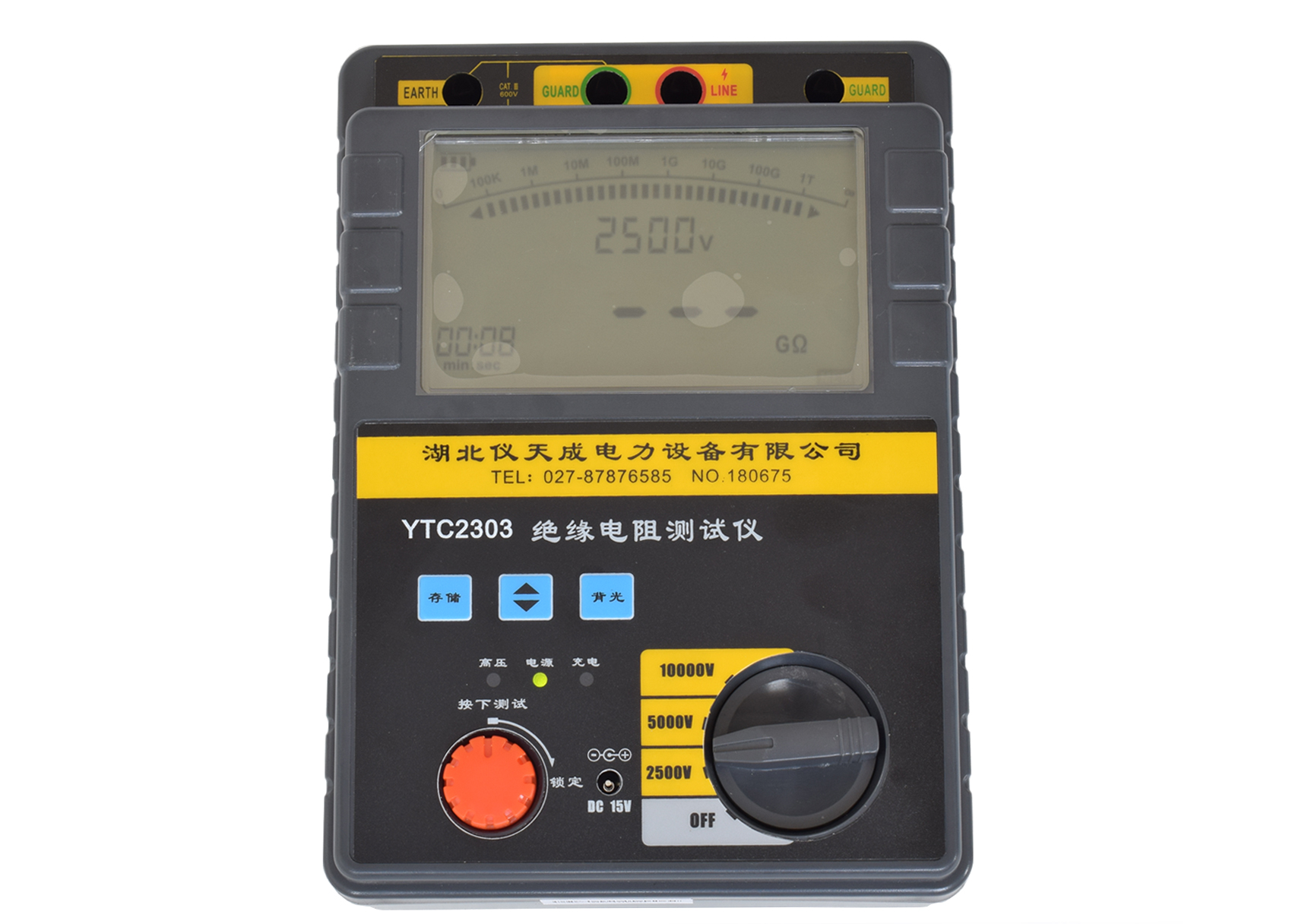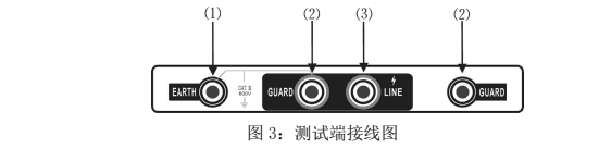 3、將帶高壓測試線紅色插頭端插入(3)LINE端,綠色插頭端插入(2)GUARD端,另一端探針或夾子接于被試設備的高壓導體上。將測試線副線(綠色)插入(2)GUARD端(右手邊),另一端接于被試設備的高壓護環上,以消除表面泄漏電流的影響(詳見“屏蔽端的使用方法”相關內容。將另外一根黑色副線測試線插入地端(EARTH)(1)端,另一頭接于被試設備的外殼或地上。