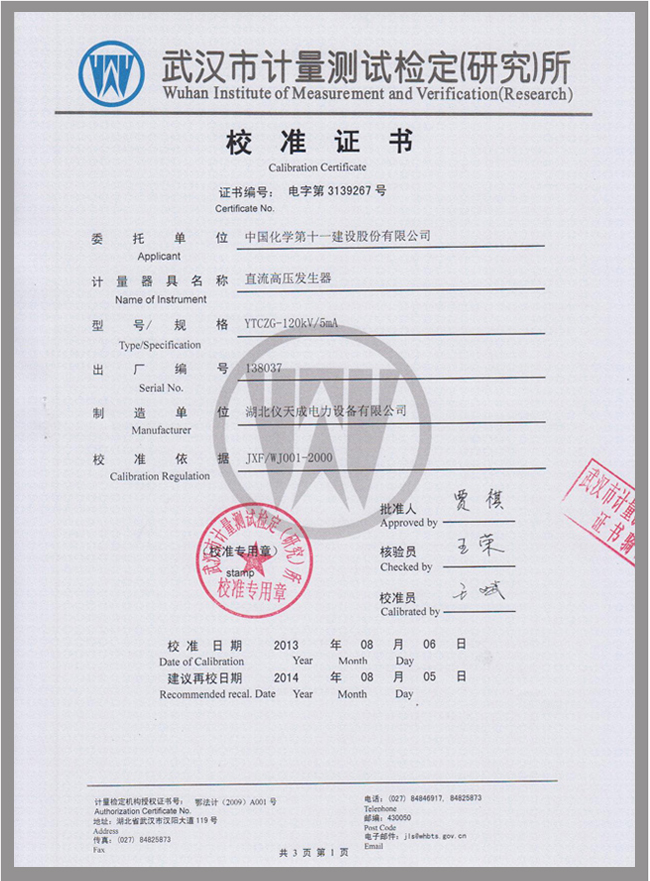 轉(zhuǎn)載:"YTCZG-120kV/2mA直流高壓發(fā)生器鑒定證書" 請(qǐng)注明來源于儀天成電力。 更多技術(shù)問題請(qǐng)致電儀天成電力客戶服務(wù):027-87876585,技術(shù)部專線:027-87876585,在線客服:
