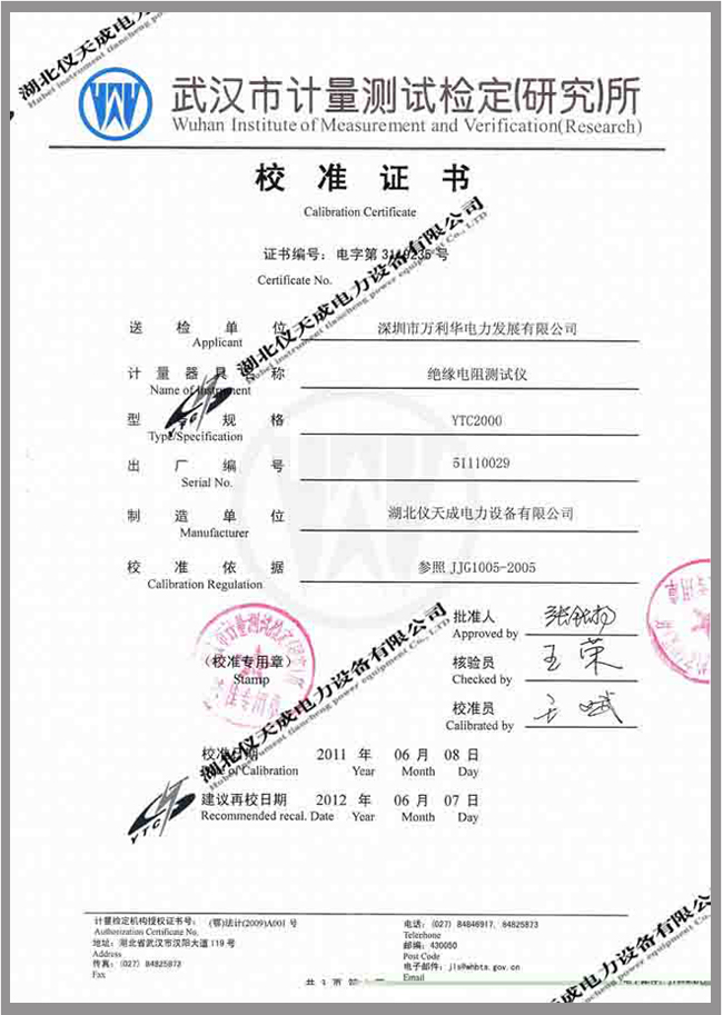 轉(zhuǎn)載:"YTC2000智能雙顯絕緣電阻測(cè)試儀鑒定證書" 請(qǐng)注明來(lái)源于儀天成電力。 更多技術(shù)問題請(qǐng)致電儀天成電力客戶服務(wù):027-87876585,技術(shù)部專線:027-87876585,在線客服: