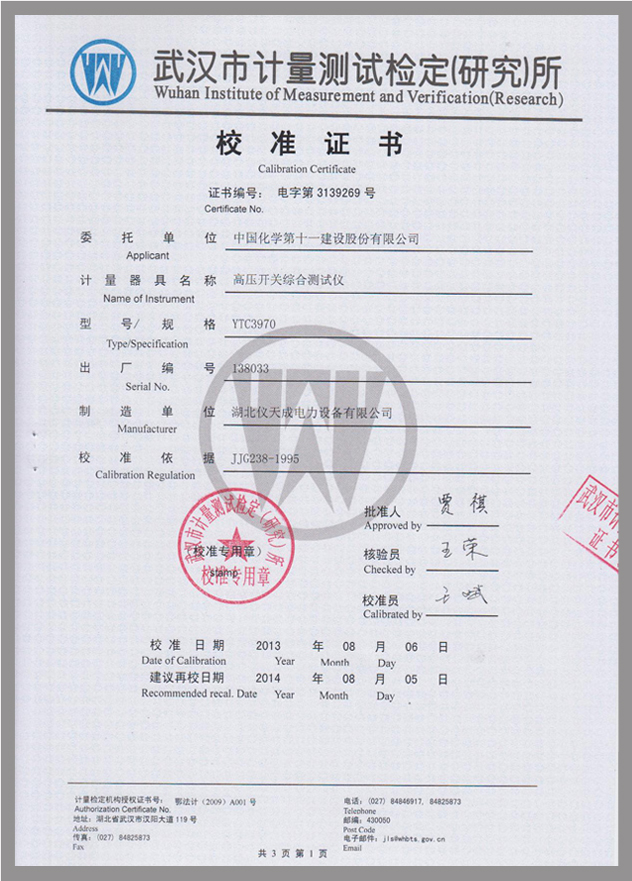 轉(zhuǎn)載:"YTC3970高壓開(kāi)關(guān)動(dòng)特性測(cè)試儀鑒定證書(shū)" 請(qǐng)注明來(lái)源于儀天成電力。 更多技術(shù)問(wèn)題請(qǐng)致電儀天成電力客戶服務(wù):027-87876585,技術(shù)部專(zhuān)線:027-87876585,在線客服: